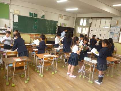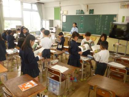 3年1組では国語科「自然のかくし絵」を学習しています。本時では「はじめ」「中」「おわり」に分けて文章の組み立てについて考えます。まずは、グループに分かれて、本文を音読し合います。