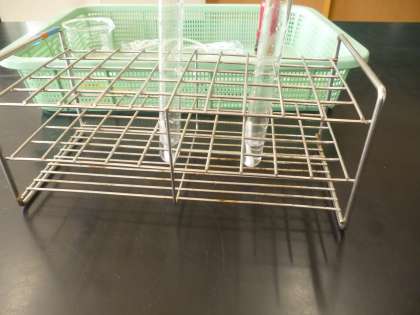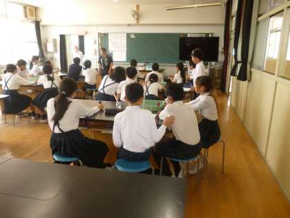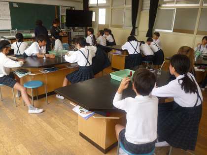 6年1組では理科の時間に、だ液のはたらきについて調べる実験をしていました。うすいでんぷん液が入った2つの試験管を用意し、一方にはだ液を染み込ませた綿棒を、もう一方には水を染み込ませた綿棒を入れ、2分間温めます。その後、ヨウ素溶液を1・2滴落として、色の変化を観察していました。