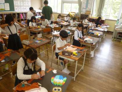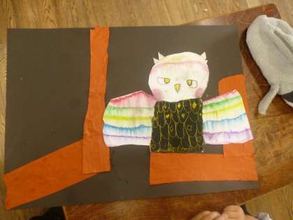 3年 不思議なフクロウ1 公開日 2025/05/15 更新日 2025/05/15 3年 3年生は図画工作科「不思議なフクロウ」に取り組んでいました。フクロウが木の枝にとまっている様子を表現します。パスを使ってフクロウを描いていましたが、「ぼかし」「重ね塗り」「スクラッチ(爪楊枝でひっかく)」の技法を凝らしていました。 いいね(0)