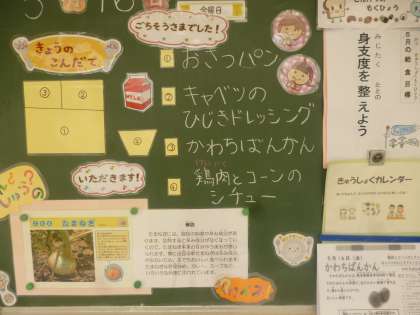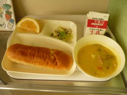 5月16日(金)の給食は、おさつパン・牛乳・鶏肉とコーンのシチュー・キャベツのひじきドレッシング・かわちばんかんです。鶏肉とコーンのシチューはアレルギー対応の大豆除去食になっています。