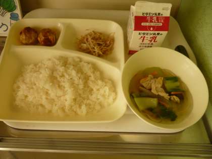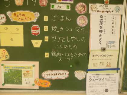 5月19日(月)の給食は、ごはん・牛乳・焼きシューマイ・鶏肉と春雨のスープ・ツナともやしの炒め物です。