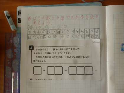 5年 正方形が1個増えると…… 公開日 2025/05/19 更新日 2025/05/19 5年 5年2組では算数科の時間に、次の問題に取り組んでいました。1つの正方形を作るのに、使う棒は4本です。では、正方形を2つ作ったら棒は何本?正方形が3つなら棒は何本? みんな表の中に慎重に数字を書き込んでいました。 次は、計算で求められるように式を考えます。 いいね(0)