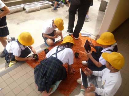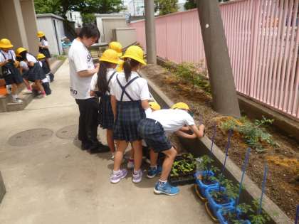 3年1組では理科の時間に「ホウセンカ・ひまわりの観察」に取り組んでいました。ホウセンカやひまわりは、ポットを使って大切に育てています。