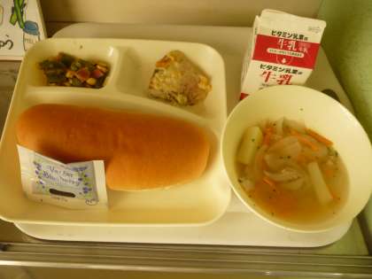 5月20日(火)の給食は、コッペパン・ブルーベリージャム。牛乳・カツオのガーリックマリネ焼き・押麦のスープ・グリーンアスパラのソテーです。