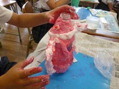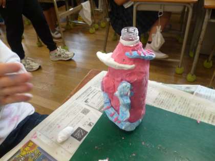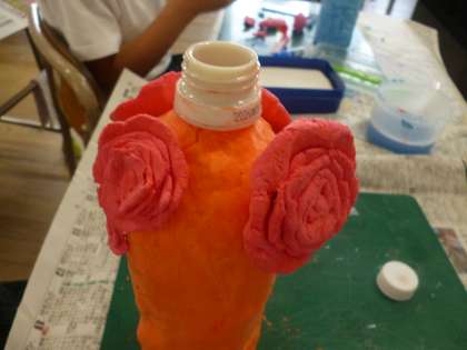 時間が経って、完成に近づいてきました。ペットボトルの周りには、花・動物・模様など、鮮やかな色の飾りがつけられています。でき上がりが楽しみです。