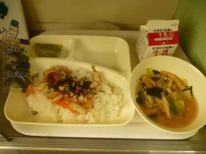 5月21日(水)の給食は、かやくご飯(きざみのり)・牛乳・みそ汁・抹茶ういろうです。