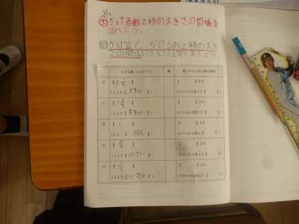 6年 かける数と積の大きさの関係 公開日 2025/05/26 更新日 2025/05/26 6年 6年2組では算数科の時間に、かける数と積の大きさの関係について調べていました。「かける数が『1』より大きいか小さいか」が、「積がかけられる数よりも大きくなるのか小さくなるのか」と関係することがわかってきました。 いいね(0)