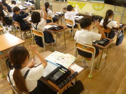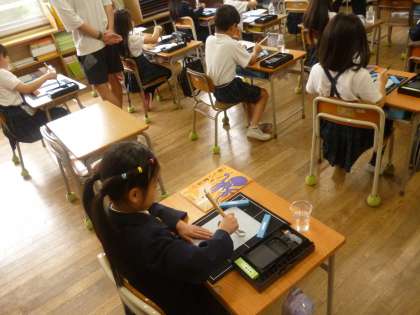 3年2組では、書写の時間に毛筆の用具も片付け方について学んでいました。みんな、ペットボトルやプラスチックのコップを用意しています。それは、筆を洗うときに使うためでした。