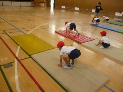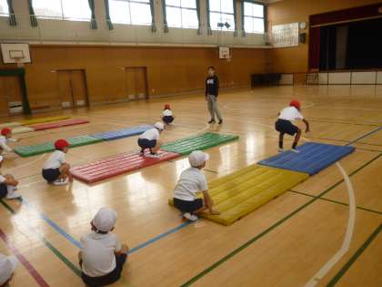 1年 マット遊び 公開日 2025/05/26 更新日 2025/05/26 1年 1年2組では体育科の時間に、マット遊びに取り組んでいました。まずは、「ゆりかご」体を前後に揺らしています。 次は「かえる跳び」前に進むようにして跳んでいきます。難解で跳びきれるでしょうか。 いいね(0)
