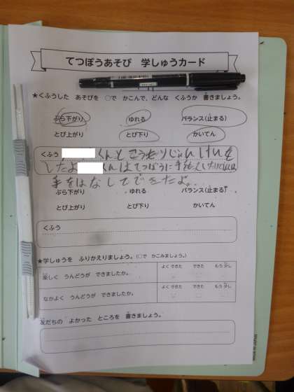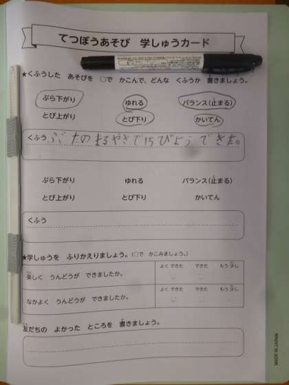 2年 てつぼうあそび 学習カード 公開日 2025/05/27 更新日 2025/05/27 2年 2年生は体育科の授業が終わって「てつぼうあそび 学習カード」に取り組んでいました。「ぶら下がり」「とび上がり」など、工夫した技に丸をつけます。そして、工夫した内容を文章で表します。「こうもりのように……」「手をはなして……。」などがんばって書いていました。 いいね(0)