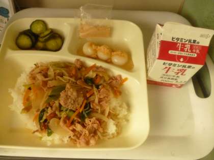 5月29日(木)の給食は、豚丼・牛乳・きゅうりのかつお梅風味・白玉だんご(きな粉)です。