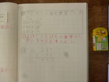 3年 3けた+3けたの筆算 公開日 2025/05/29 更新日 2025/05/29 3年 3年1組では算数科の時間に、「3けた+3けた」の筆算の仕方について考えていました。「237+195」では、くり上がりが2回あるようです。「745+531」では、千の位にくり上がるようです。それでも驚かず、これまでと同じように解いて構わないことがわかりました。 いいね(0)