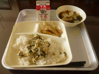 6月5日(木)の給食は、ごはん・牛乳・いわし天ぷら・五目汁・とりなっ葉炒めです。