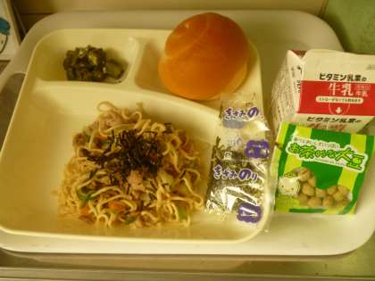 6月6日(金)の給食は、ミニコッペパン・牛乳・和風焼きそば(きざみのり)・オクラのかつお梅風味・抹茶大豆です。