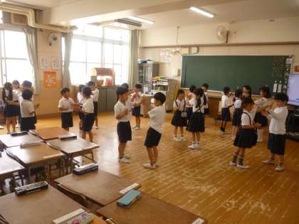 1年2組では音楽科「ぶん ぶん ぶん」を大型テレビの画面を観ながら歌っていました。次は2人組になって振り付けをつけながら歌います。笑い声も聞こえるくらい楽しそうに歌って踊っていました。次は、相手を替えて歌います。