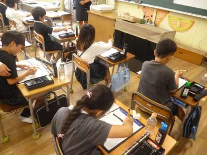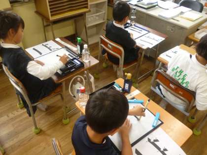 3年 毛筆「一」 公開日 2025/06/11 更新日 2025/06/11 3年 3年1組では書写の時間に毛筆で横画「一」を練習していました。手本を半紙の下に敷いて、上でなぞっていくのですが、なかなかうまくいかないようです。筆に墨をたっぷりつけないと途中でかすれてしまいます。筆は立てて、ひじから動かしていくのも忘れないように、がんばって練習していました。 いいね(0)