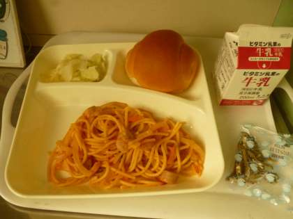 6月13日(金)の給食は、ミニコッペパン・牛乳・チキントマトスパゲッティ・キャベツのピクルス・ミニフィッシュです。