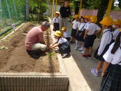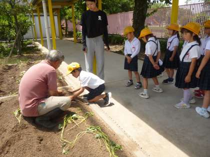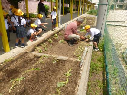 今日は、1年2組の子どもたちが、サツマイモの苗植えを体験させていただきまいた。これから、水やりなどのお世話もお願いします。
