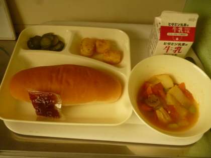 6月17日(火)の給食は、コッペパン・いちごジャム・牛乳・イカ天ぷら・きゅうりのバジル風味サラダ・フレッシュトマトのスープ煮です。フレッシュトマトのスープ煮は、大豆のアレルギー対応除去食です。