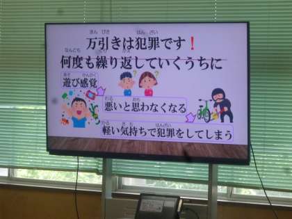 5年 非行防止教室 公開日 2025/06/17 更新日 2025/06/17 5年 難波少年サポートセンターと大正警察の方々を講師にお越しいただいて、「非行防止教室」を実施しました。ペープサートで「非行」や「万引き」の場面を演じていただき、万引きは窃盗罪という犯罪であること、自分だけでなく周囲も巻き込んでつらい思いをすることに気づかせていただきました。 あと1か月余りで夏休みになります。気持ちに油断ができるかもしれません。今日教えていただいたことを忘れないようにして過ごしてほしいです。 いいね(0)