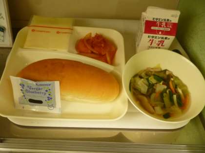 6月26日(木)の給食は、コッペパン・ブルーベリージャム・牛乳・エビのチリソース・中華スープ・スライスチーズです。