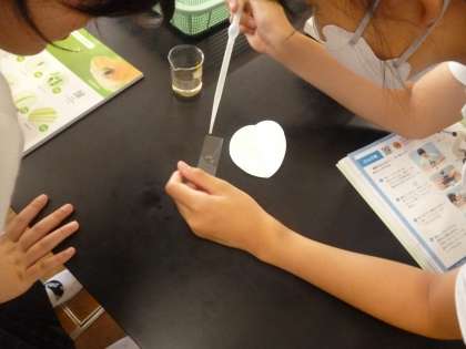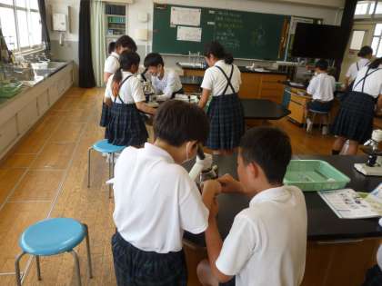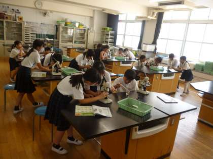 6年2組では理科の時間、生き物を飼っている水槽の水をとって顕微鏡で観察していました。自然界のメダカはエサを与えなくても育っています。その理由を確かめるべく、水槽の水を調べてみると……。小さな生き物が見えてきました。