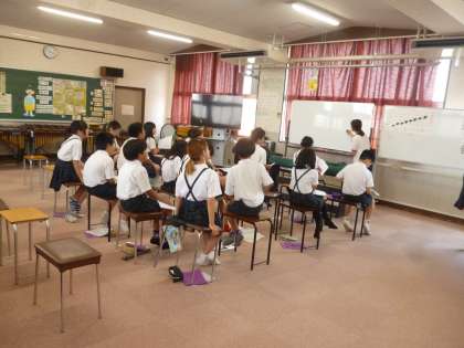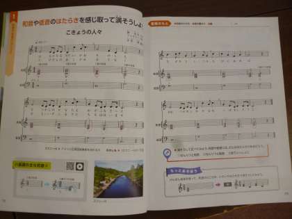 5年1組では音楽科「こきょうの人々」に取り組んでいます。主旋律の下の高音のパートでは和音が続いています。低音のパートには見慣れない「へ音記号」や「全音符」が使われています。へ音記号の「ド」の位置はト音記号の「ド」の位置とは違うようです。へ音記号に早く慣れてほしいです。