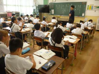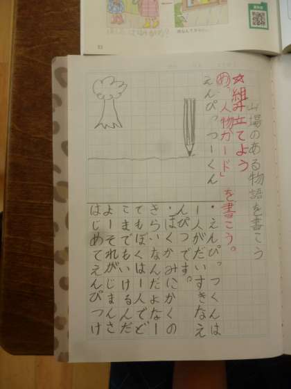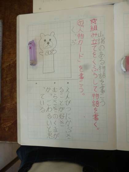 4年生では国語科「山場のある物語を書こう」に取り組んでいます。まずは、物語に登場する人物について、性格や思いを説明した「人物カード」を作ります。どんな人物を登場させるかは、物語に大きく関わってきます。物語のあら筋や山場も考えながら人物カードを書いていました。