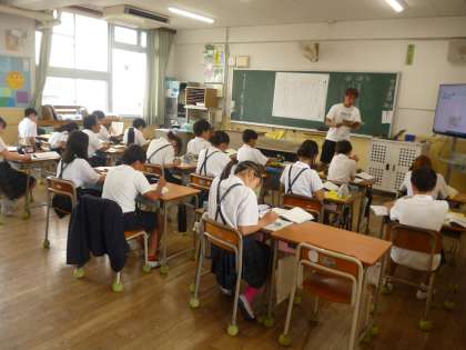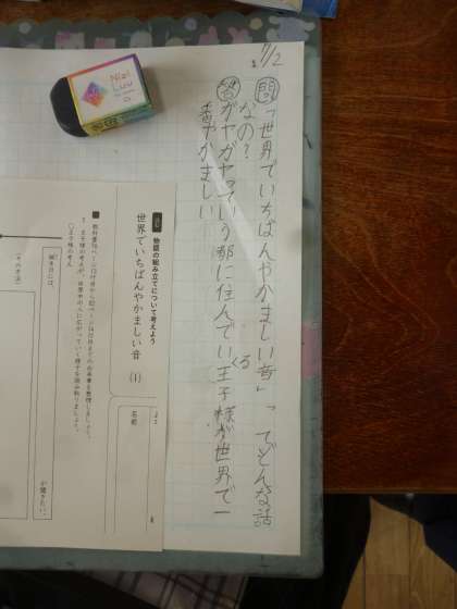 5年1組は国語科「世界でいちばんやかましい音」を学習しています。「世界でいちばんやかましい音ってどんな音なのか?」を考えました。続いて、王子様の考えが国中の人々に広がっていく様子を読み取ってワークシートにまとめていきます。先生が物語を読むのを聞きながら、ワークシートの□の中に書き込んでいきました。