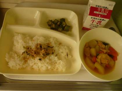 7月3日(木)の給食は、ごはん・牛乳・鶏肉と一口がんもの煮物・オクラの梅風味・ツナっ葉炒めです。