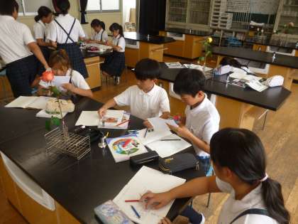 6年生は理科「レインボーローズを作ろう」に取り組みました。植物が根から吸い上げた水は花まで行き渡るので、その性質を利用します。赤や黄・青色の液に白いバラを挿し木して、しばらく待つと、次の写真のような素敵なバラが生まれます。
