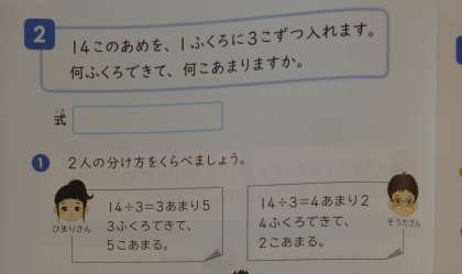 3年 あまりのあるわり算 公開日 2025/07/04 更新日 2025/07/04 3年 3年1組では算数科の時間に次の問題に取り組んでいました。「14個の飴を1袋3個ずつ入れると、何袋できて何個あまるでしょうか。」答えは「3袋できて5個あまる」のでしょうか、それとも「4袋できて2個あまる」のでしょうか。子どもたちはノートに図をかいて、丁寧に考えていました。 いいね(0)
