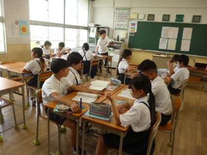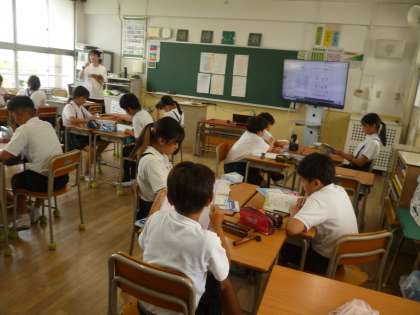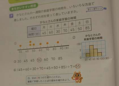 6年2組では算数科「データの調べ方」のまとめ問題に取り組んでいました。この単元では、データの特徴を5年生の時に習った「平均値」だけでは表しきれないことを学びました。「中央値」「分布図」「柱状グラフ」……、覚えているでしょうか。