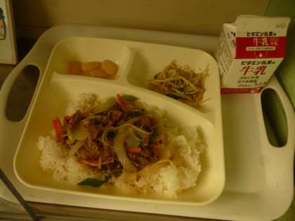 7月9日(水)の給食は、牛丼・牛乳・もやしとピーマンのゴマ炒め・大福豆の煮物です。