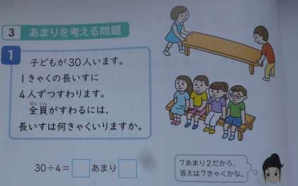 3年 長いすは何脚いるのかな?1 公開日 2025/07/09 更新日 2025/07/09 3年 3年生は算数科「あまりのあるわり算」に取り組んでいます。次の問題を考えていました。子どもが30人いて、1脚に4人ずつ座るので、「30÷4=7あまり2」 ここまでは、みんなできました。答えは「7脚」でいいのでしょうか。 いいね(0)