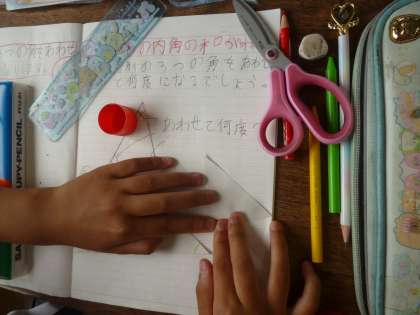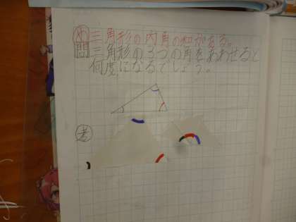5年 三角形の内角の和 公開日 2025/07/11 更新日 2025/07/11 5年 5年1組では算数科の時間に三角形の内角の和について考えました。3か所の角に色鉛筆で印をつけて、3つにちぎりました。そして、3つの頂点を合わせるように角を合わせると……。 いいね(0)