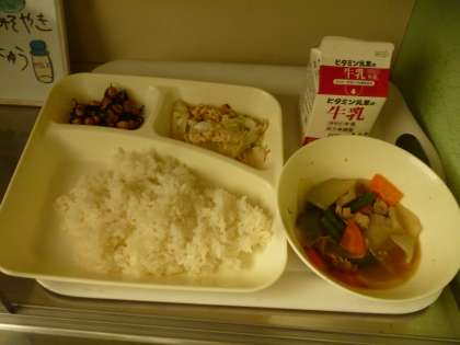 7月14日(月)の給食は、ごはん・牛乳・豚肉と野菜の煮物・ひじき豆・ささみとキャベツのゴマみそ焼きです。