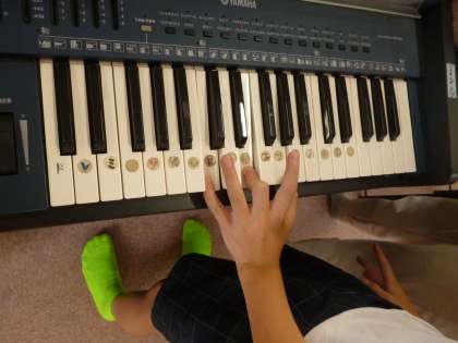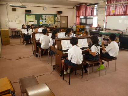 5年1組では音楽科「こきょうの人々」に取り組んでいます。この曲では和音のはたらきを感じ取りながら演奏します。オルガンでハ長調の主な和音を弾く練習をしていました。慣れていない児童は、左手で複数のけん盤を弾くのが難しそうでした。