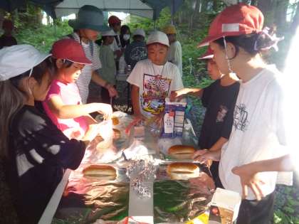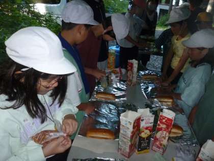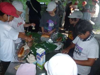 朝食は自分たちで作ります。「カートンドッグ」作りをします。