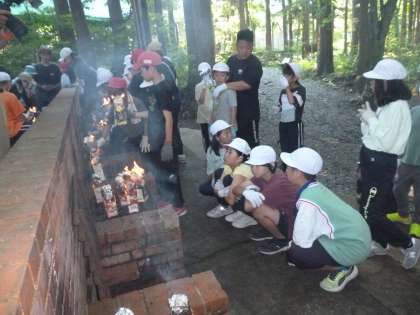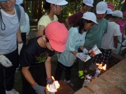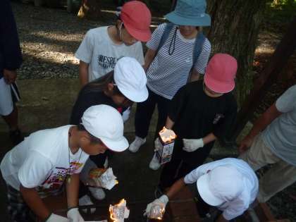 ホットドッグを包んだアルミホイルを、さらに牛乳パックに入れて火を点けました。