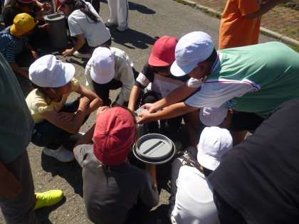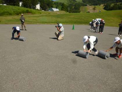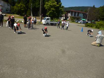 2つ目のゲーム、班が協力し合って「折り返しリレー」を行います。