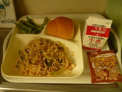 8月26日(火)の給食は、ミニコッペパン・牛乳・焼きそば・枝豆・おさつチップスです。