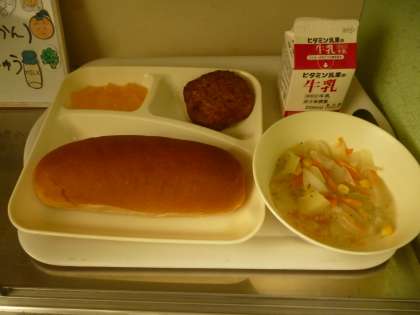 8月28日(木)の給食は、黒糖パン・牛乳・焼きハンバーグ・豆乳スープ・ダイスゼリー(みかん)です。豆乳スープは大豆の除去食になっています。
