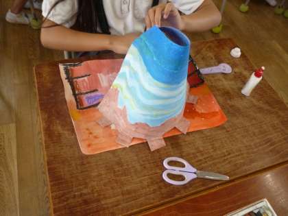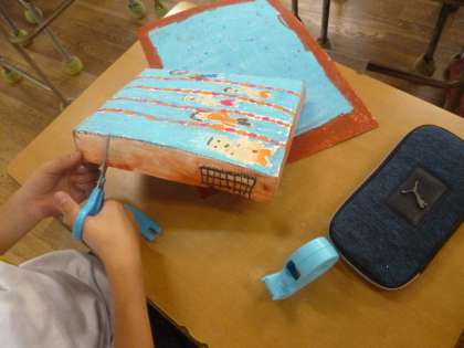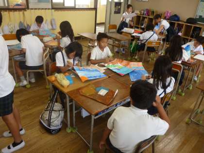 3年1組では図画工作科「飛び出る絵」に取り組んでいました。まず夏の思い出を絵に表しました。ここからが本番です。この絵をいろいろな方法で切ったり貼ったりしながら、立体的な絵にしていきます。切り込みを入れて、のりしろを作って、ボンドをつけて、貼り合わせて……。