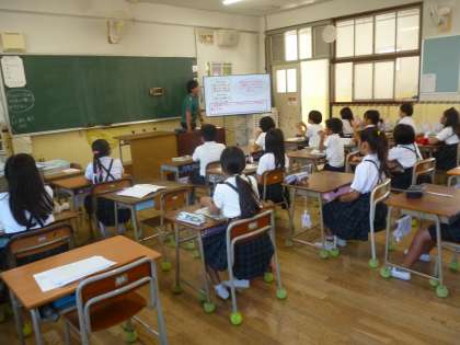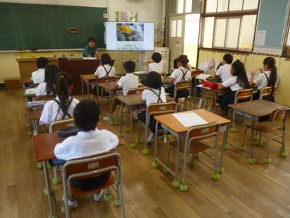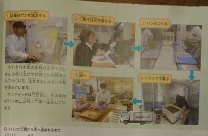 3年1組では社会科の時間にパン工場におけるパン作りの工程を復習していました。「計量・生地作り」、「発酵」、「成形」、「焼く」、「包装」の5つのステップを大型テレビの画面で確認していました。材料の計量、発酵による生地の膨らみ、形を整える、オーブンで焼き上げる、製品の検品と包装、パン作りをして働く方々の技や工夫も確かめることができたようです。