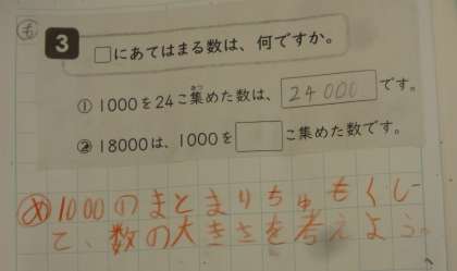 3年 大きな数 公開日 2025/09/02 更新日 2025/09/02 3年 3年2組では算数科「大きな数」を学習しています。次の問題について考えていました。絵を参考にしながら、「1000が10個集まると……。」「1000があと4個残っているので……。」と考えていました。 いいね(0)