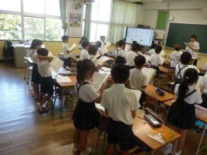 2年生は国語科「空に ぐうんと 手を のばせ」を学習しています。この詩は3つの連で構成されているのをみんなで確かめました。次は、動作をつけながら、この詩を朗読できるように取り組みます。挿絵も参考にしながら、この詩に動作をつけます。