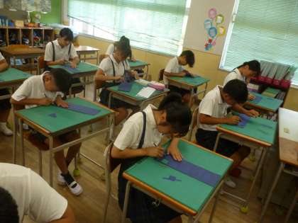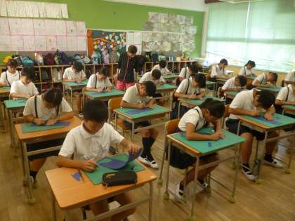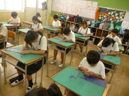 6年1組では図画工作科「自分の名前を彫ろう」に取り組んでいます。色画用紙に自分の名前をアルファベットで表し、余白をカッターナイフで切り落としていました。この後、いろいろな工夫を凝らして、素敵な作品に仕上げていくようです、作品展がとても楽しみです。