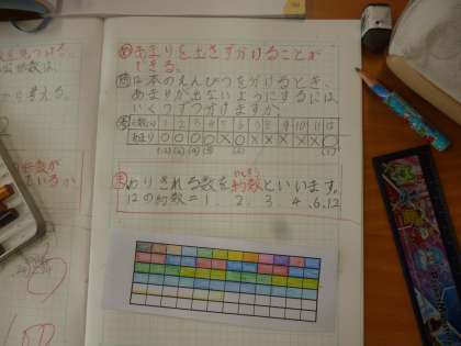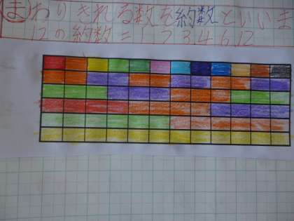 5年 12の約数 公開日 2025/09/04 更新日 2025/09/04 5年 5年1組では算数科の時間に「12本の鉛筆を同じ数ずつ配る時、余りが出ないように分けられる人数」について考えていました。そして、12をわりきることのできる整数を約数ということを知りました。 3番目のワークシートを使って、「12をあまりがでないように色分けし」ながら考えていました。 いいね(0)