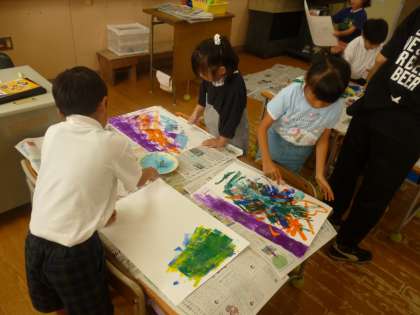 1年2組では図画工作科「コロコロしよう」に取り組んでいます。気に入った色が用意されている机に移動して、ローラーでコロコロ色を塗っていきます。仲良く作業を進めていました。